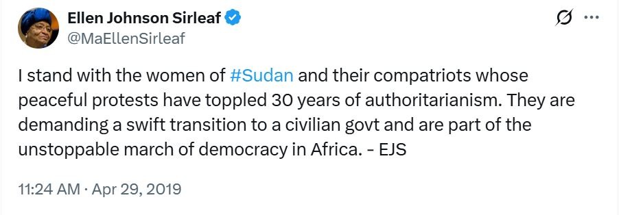 كنا وقتها نتناقش عن ثورتنا كنساء شهدن ثورة ديسمبر، بدأت حكايتها بتويتة كتبتها الرئيسة السابقة لليبيريا Ellen Johnson Sirleaf عن الثورة و النساء السودانيات