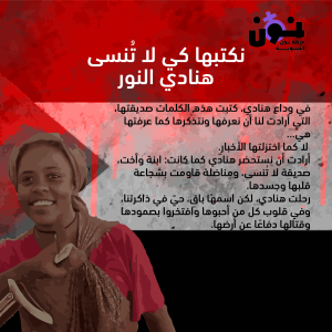 ننعي انفسنا في الشهيدة المناضلة الجسورة هنادي النور فضل داوود جمعة، التي لاقتها المنية ببطش المليشيا الغادرة التي اقتحمت معسكر زمزم في يوم الاحد 13 ابريل. هنادي مثل أي شابة غضة في عمرها، كانت لها أحلام وطموحات، حالت الحرب دونها، الا ان الثمن كان باهظا. هنادي لها صديقات ورفيقات في